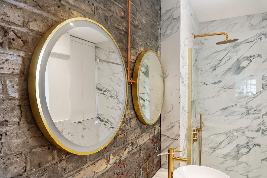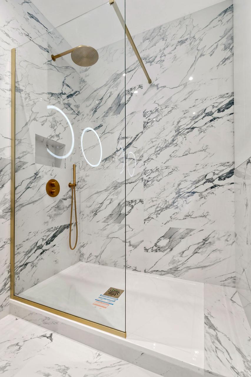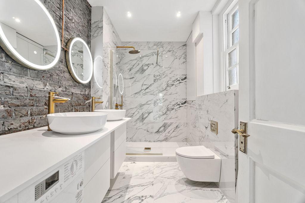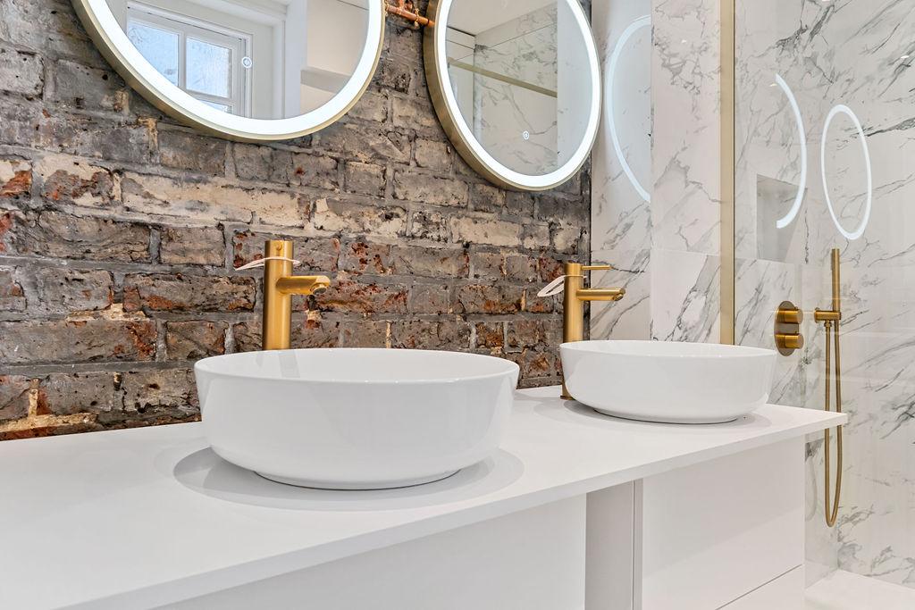 The bathroom is a testament to modern luxury, featuring large white marble tiles with intricate grey veining that create a sophisticated and clean look. The white vanity with a smooth, matte finish complements the two round vessel sinks, maintaining a cohesive and minimalist colour scheme. A hint of exposed grey brick wall adds a just a touch of brutalist design, a rustic texture contrasting beautifully with the otherwise polished surfaces. The large walk-in shower, paired with a wall-mounted toilet, adds to the bathroom’s modern and functional design, while the brass fixtures also add a subtle industrial touch, balancing the overall aesthetic with a hint of warmth.