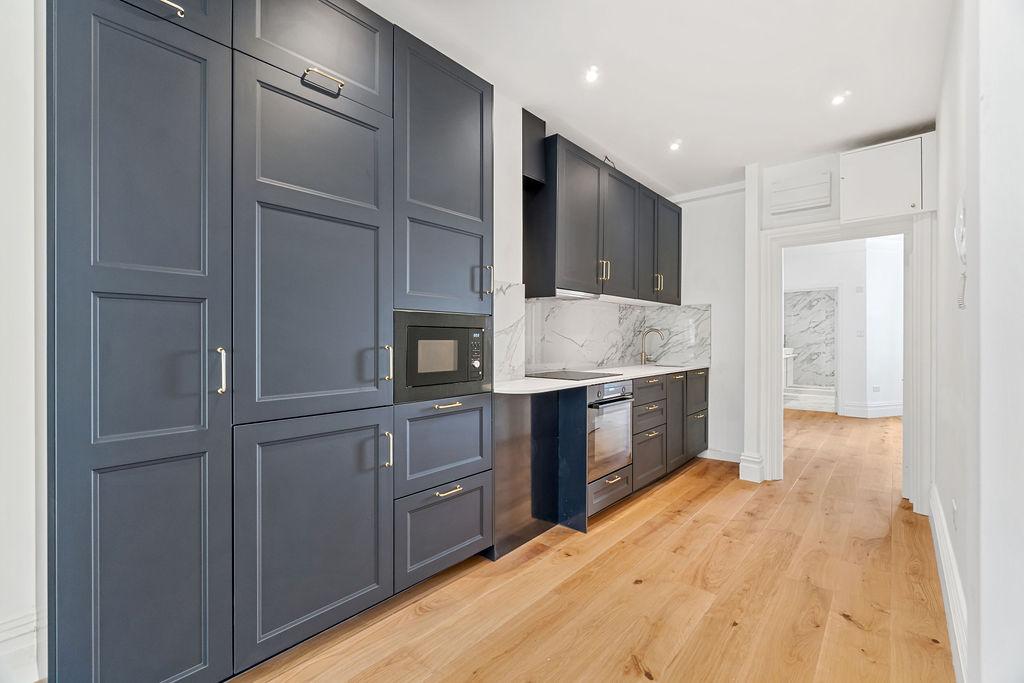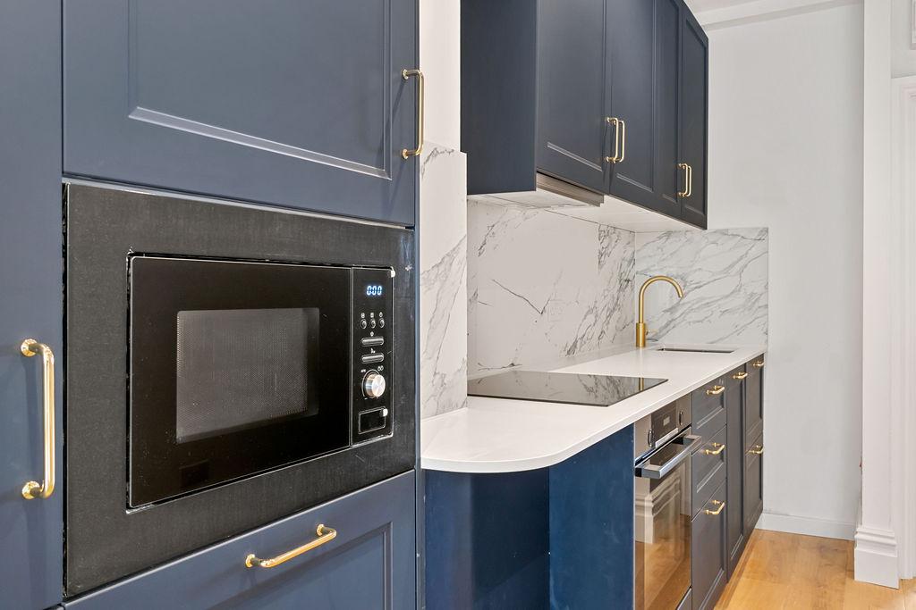 Inside the flat, is a fusion of contemporary design with Art Deco touches. The flat is well lit with the living area featuring a marble and wood fireplace, a state-of-the-art kitchen, fully equipped with top-of-the-line appliances, a bedroom with ample storage space and an exceptional bathroom. It has just undergone thorough renovation and now includes underfloor heating throughout.
