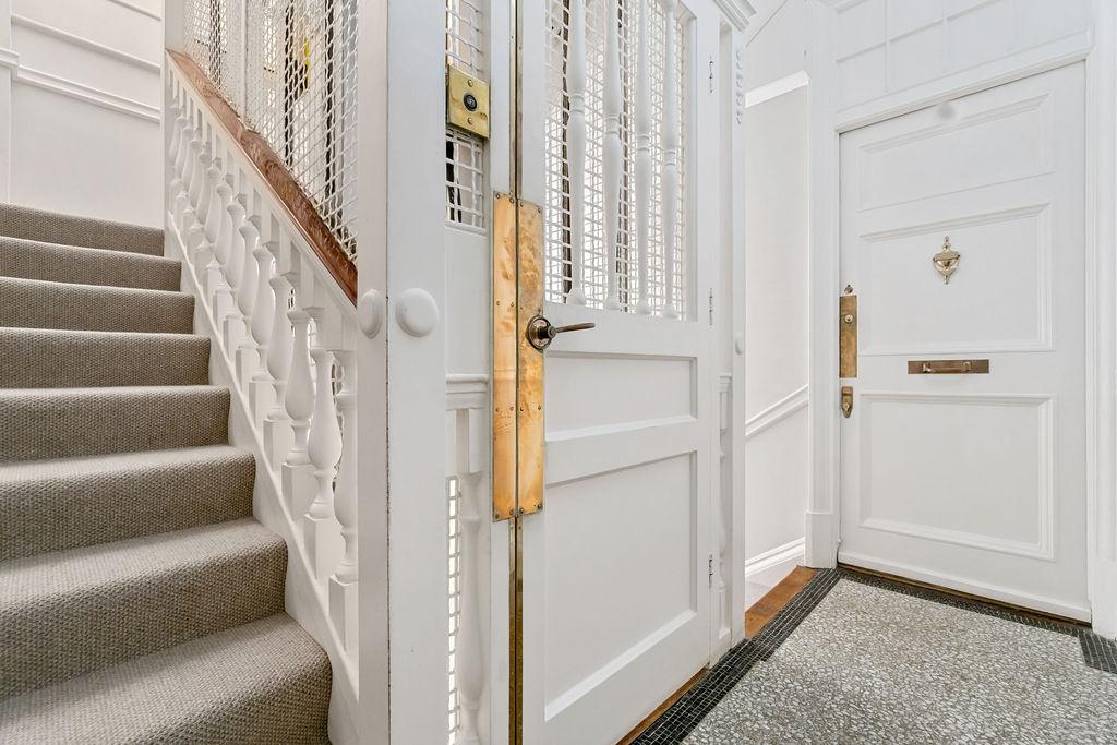 Upon entering the building, you are greeted by the delightful sight of a classic gated lift, a nod to the heritage and character of this property. This original feature sets the tone for the unique charm of this listed building.